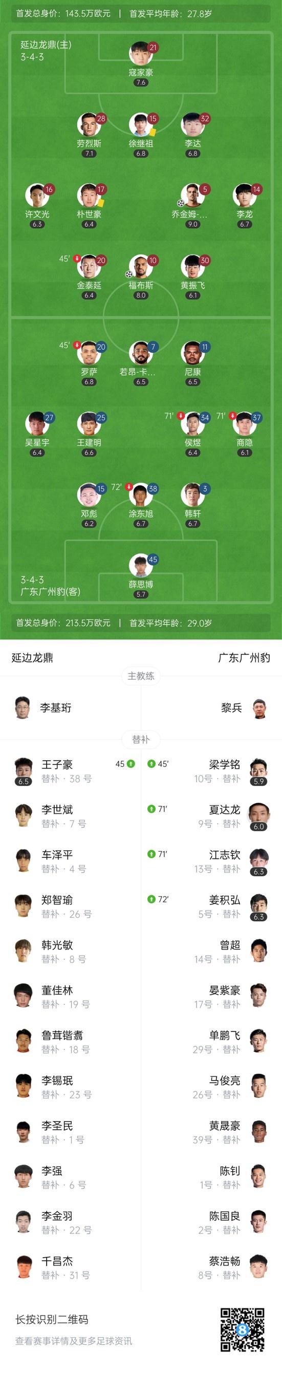 下半场补时5分钟,延边龙鼎2-0广东广州豹。
