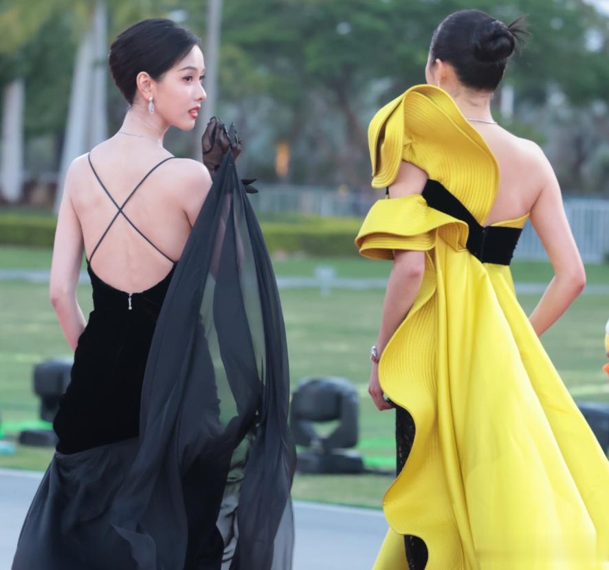 关晓彤亮黄色礼服下暗藏玄机,镂空设计蔓延全身,陈都灵黑色吊带裙乍一看平平无奇,背后另有玄机——只是好难得看到关晓彤的背面啊,怎么有点腰粗背厚的意思?考虑一下练背吧!