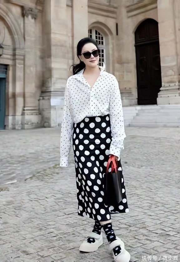 最后这套波点穿搭,真的是把复古俏皮风玩明白了!白色波点衬衫搭配黑色大波点半身裙,大小波点的组合,有趣又和谐,复古氛围直接拉满。衬衫是宽松的版型,穿起来自在又随性,微微敞开的领口,多了几分慵懒感。半身裙的长度到小腿肚,恰到好处地露出纤细的脚踝,显瘦效果一流。