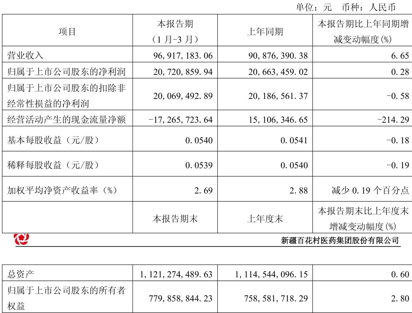 中证智能财讯百花医药(600721)4月26日披露2025年第一季度报告。公司实现营业总收入9691.72万元,同比增长6.65%;归母净利润2072.09万元,同比增长0.28%;扣非净利润2006.95万元,同比下降0.58%;经营活动产生的现金流量净额为-1726.57万元,上年同期为1510.63万元;报告期内,百花医药基本每股收益为0.054元,加权平均净资产收益率为2.69%。