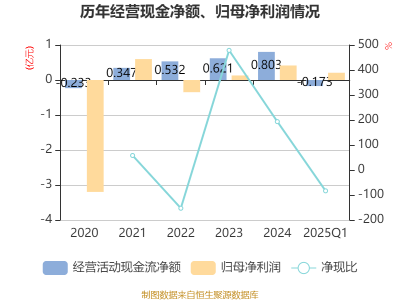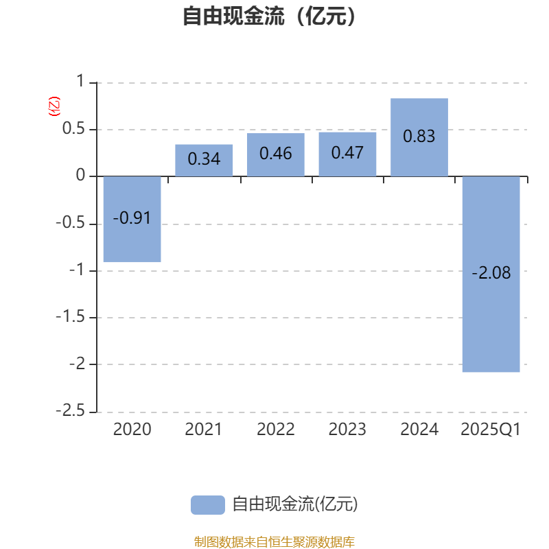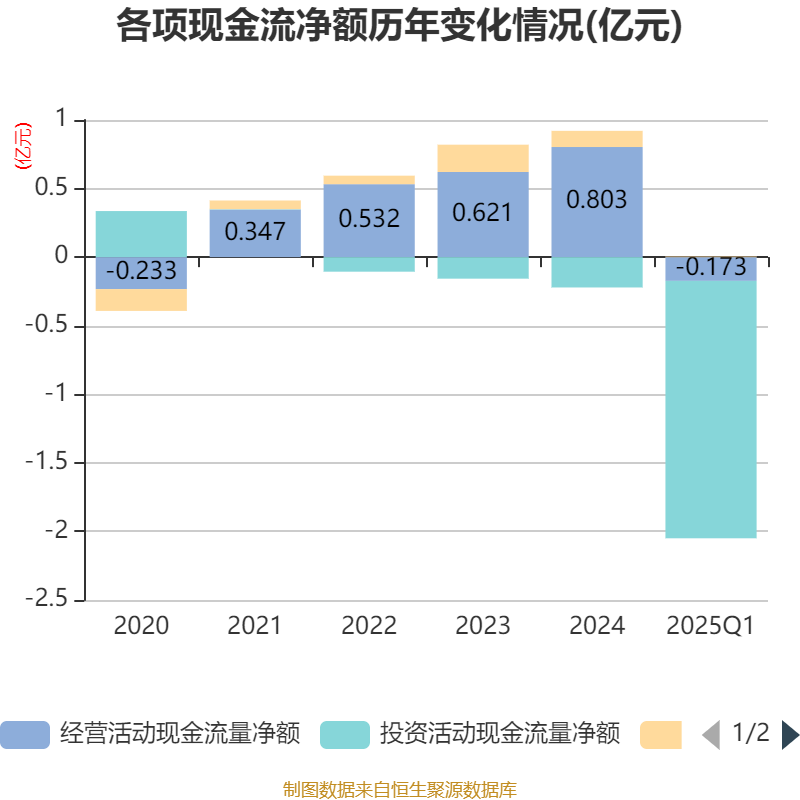 截至2025年一季度末,公司经营活动现金流净额为-1726.57万元,同比减少3237.21万元;筹资活动现金流净额52.64万元,同比减少23万元;投资活动现金流净额-1.88亿元,上年同期为-1.37亿元。
