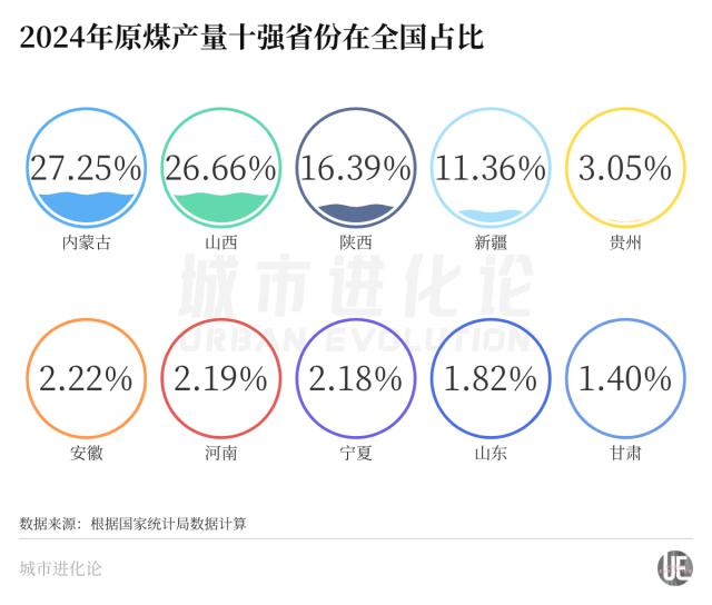 不只是这两个声名在外的"煤老大",2024 年陕西、新疆、贵州原煤产量分别为 7.80 亿吨、5.41 亿吨、1.45 亿吨,占全国的比重分别为 16.39%、11.36%、3.05%,也是全国五大煤炭省份。