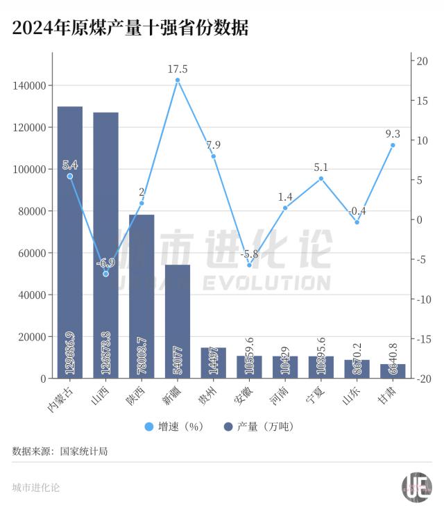 国家统计局数据显示,2024 年,内蒙古和山西原煤产量分别为 12.97 亿吨、12.69 亿吨,分别占全国产量的 27.25%、26.66%,一起贡献超"半壁江山"。今年前 8 月,两个省份原煤产量分别为 8.40 亿吨、8.63 亿吨,山西再度反超内蒙古,有望在今年全年打赢一场翻身仗。