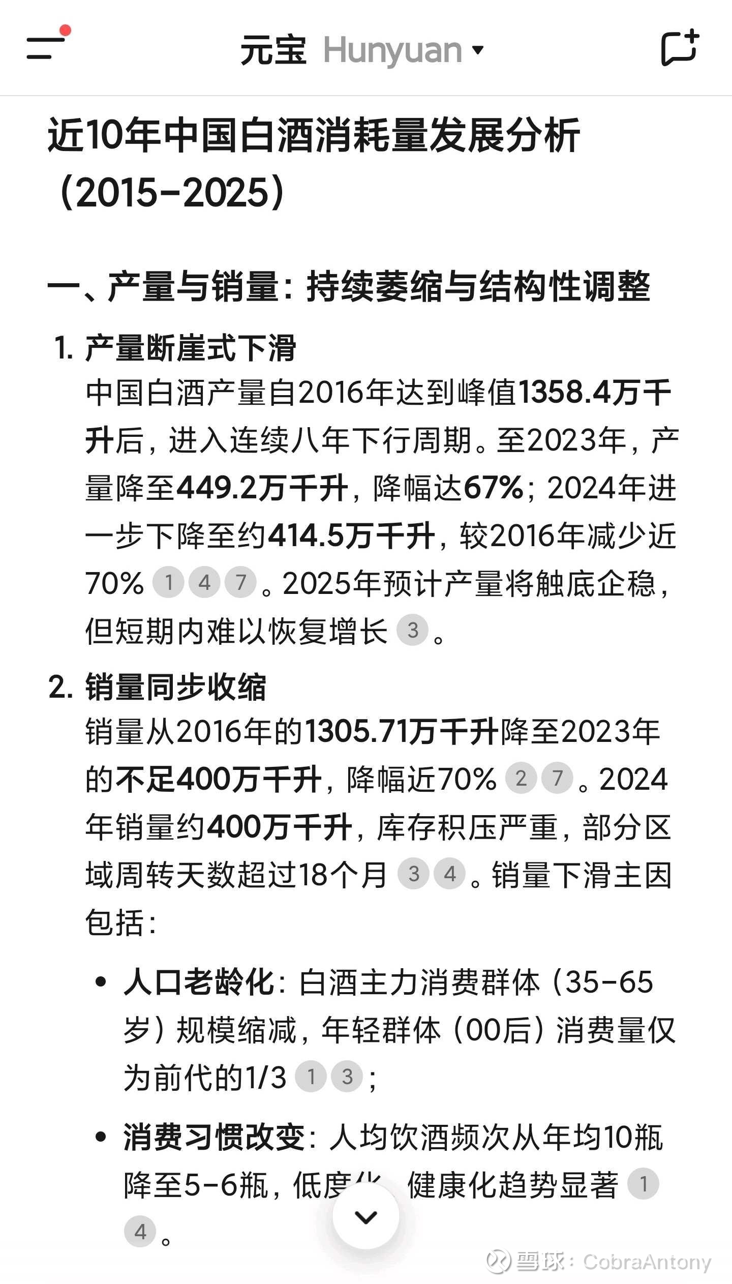 最近大家都在热烈讨论白酒,我两三年前就说别碰白酒。因为数据告诉我不能碰。腾讯元宝的回答。