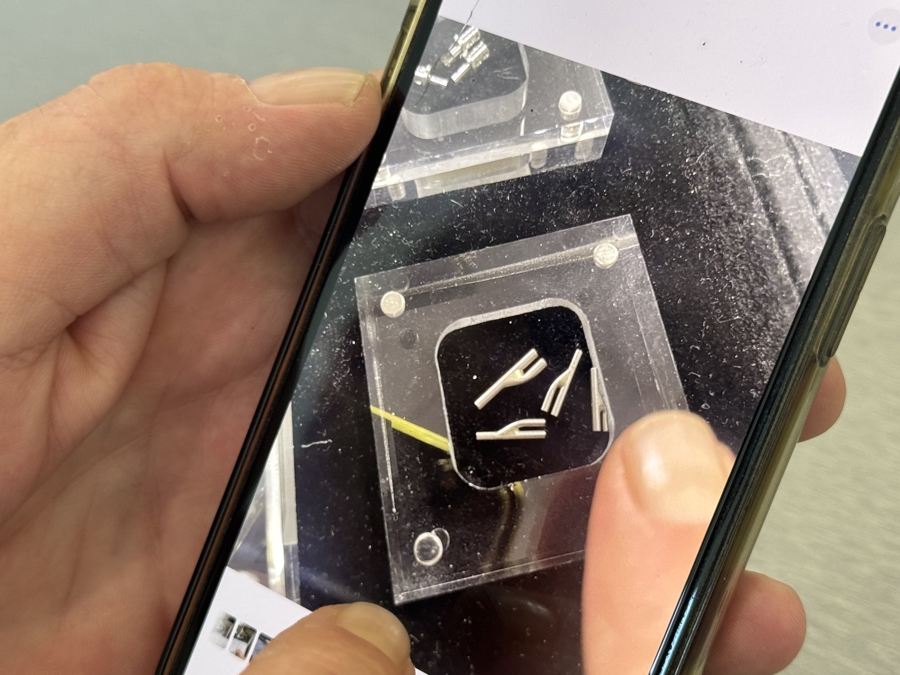 麦克向记者展示他在中国工厂拍摄的工业零配件样品。 舒抒 摄