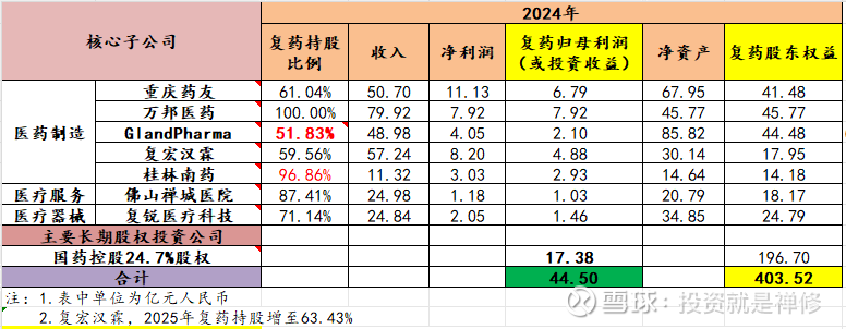 国药控股(联营)/江苏万邦/重庆药友/桂林南药/复宏汉霖/复锐医疗/禅城医院/印度GlandPharma,这8家核心公司(1家联营,7家是子公司)构成了复药利润的基石,盈利很稳定且能持续,为复药的投资并购拓展以及试错提供了稳定的资金支持。